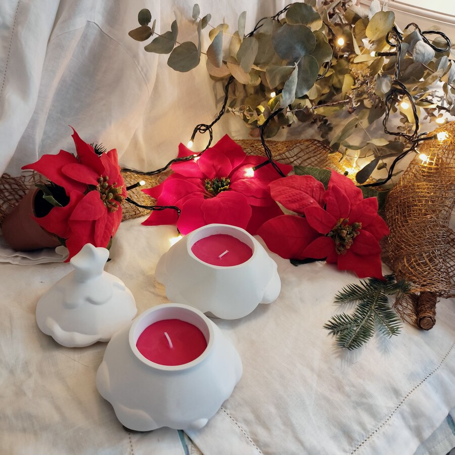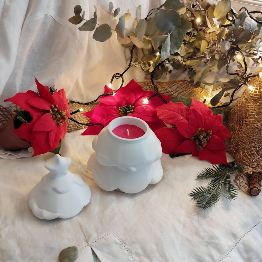 El Árbol de Navidad de yeso con velas perfumadas es una pieza artesanal que combina diseño, aroma y tradición navideña. Hecho completamente a mano, este encantador árbol se abre en dos mitades que guardan en su interior dos velas perfumadas elaboradas con ceras naturales y esencias de alta calidad. Es el regalo perfecto para quienes disfrutan de los detalles con alma y buscan llenar su hogar de luz y fragancia durante las fiestas.